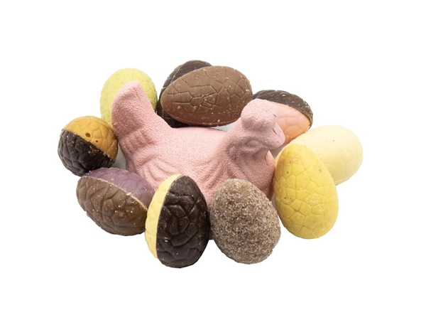 Kip van melk chocolade met diverse eitjes.